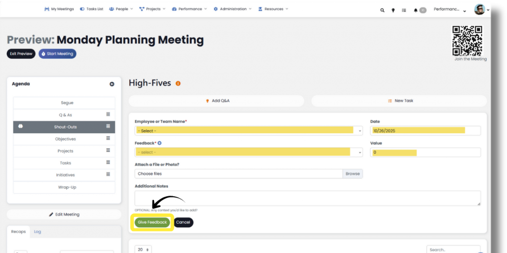 Shout-Outs in Meetings is an optional agenda item that allows meeting attendees to view and “like” company-wide Shout-Outs given to users in SecureDB for their achievements. Shout-Outs are Factor entries of positive 5 or more and can be entered from People > Shout-Outs in the nav panel or in the top portion of the Shout-Outs section of any meeting.