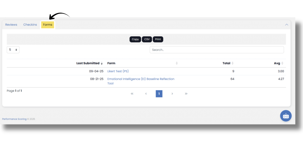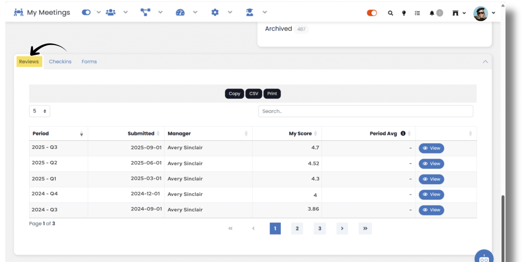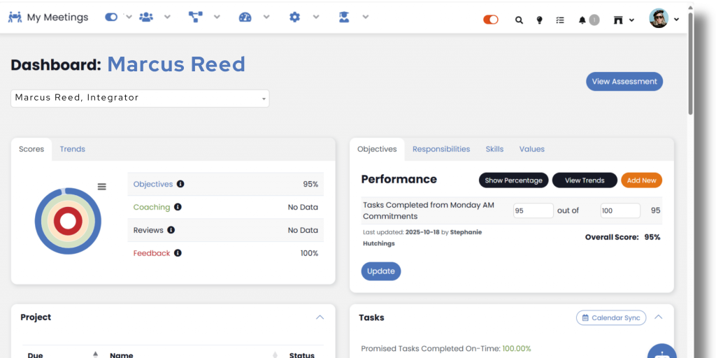 If you have users who report to you in your organization, you can access their Individual Dashboard to view and update their metrics in SecureDB. To access the Individual Dashboard, use the dropdown available on your main dashboard. At the top of the Individual Dashboard, you see the performance score (if used) on the left, which is derived from the user’s individual Objective and Coaching data, which can be found on the right. The Individual Dashboard page also displays the Projects the user is a part of and a list of their Tasks. Lastly, the page displays all of the reviews, Check-Ins, or forms that have been completed in reference to that user over time.