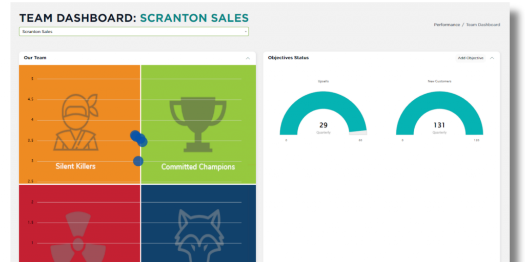 The Team Dashboard displays all Team Objective data for a selected Team. In addition to Objective data, the Team Dashboard displays a Performance/Alignment chart that shows where each team member stands in relation to those two metrics (if used by your company). For more information on navigating the Team Dashboard, click here!