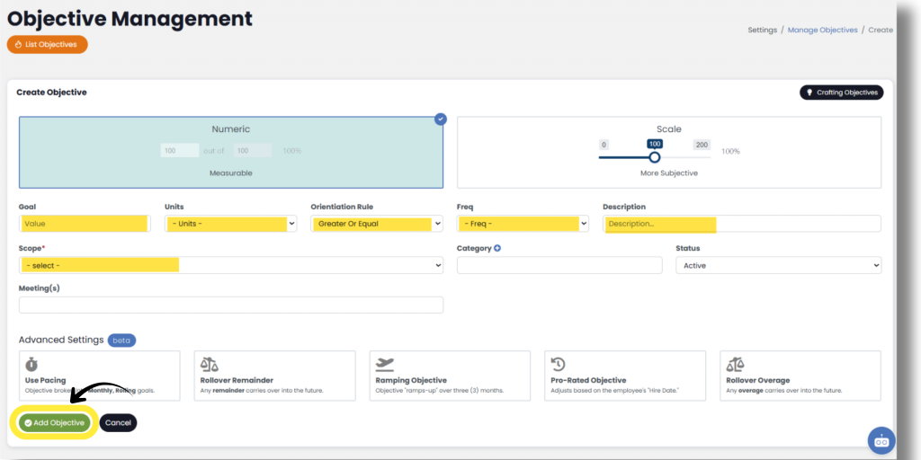 First, select whether the Objectives will be a numeric (Objective) goal or if it will be a scale goal (more subjective).