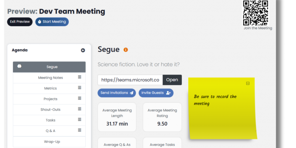 This Segue section is best looked at as a welcome page for your meetings. The Segue includes a space for a virtual meeting link that launches your preferred videoconferencing software, an optional Sticky Note that can remind attendees of something important, a QR code that allows users to quickly join the meeting via mobile device, options to invite users outside your organization via email or URL, and a question to help kick-off the meeting.