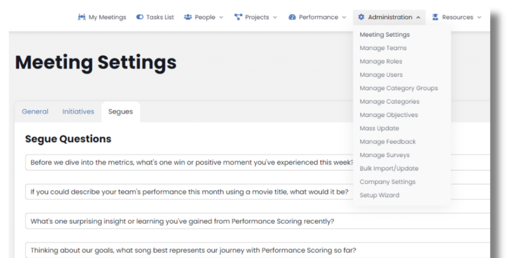 You can edit and create your own Segue questions by going to the Segues tab in Meeting Settings found under Administration on the navigation menu.