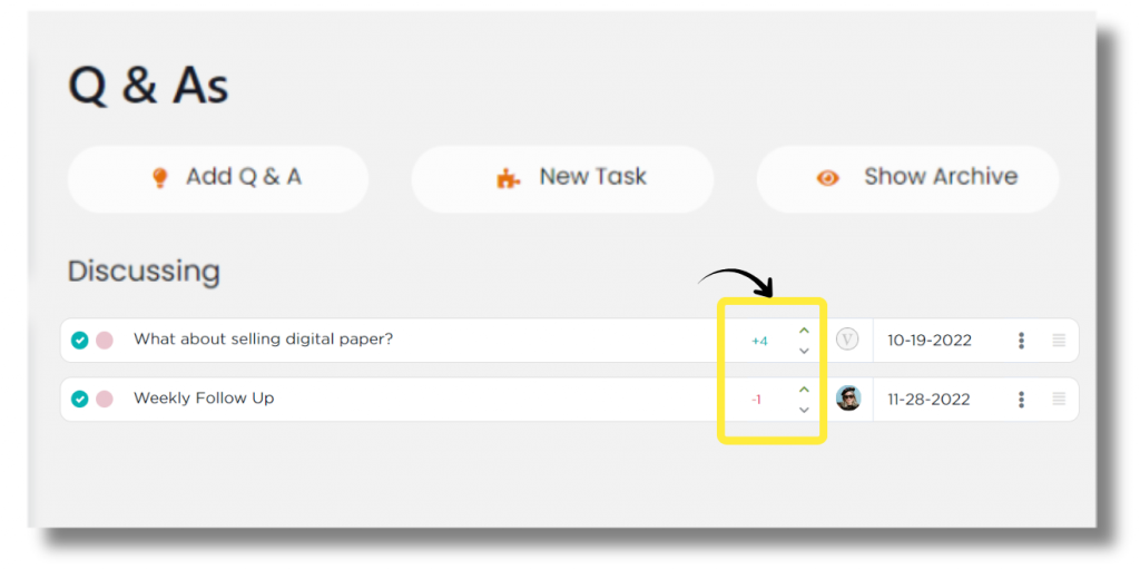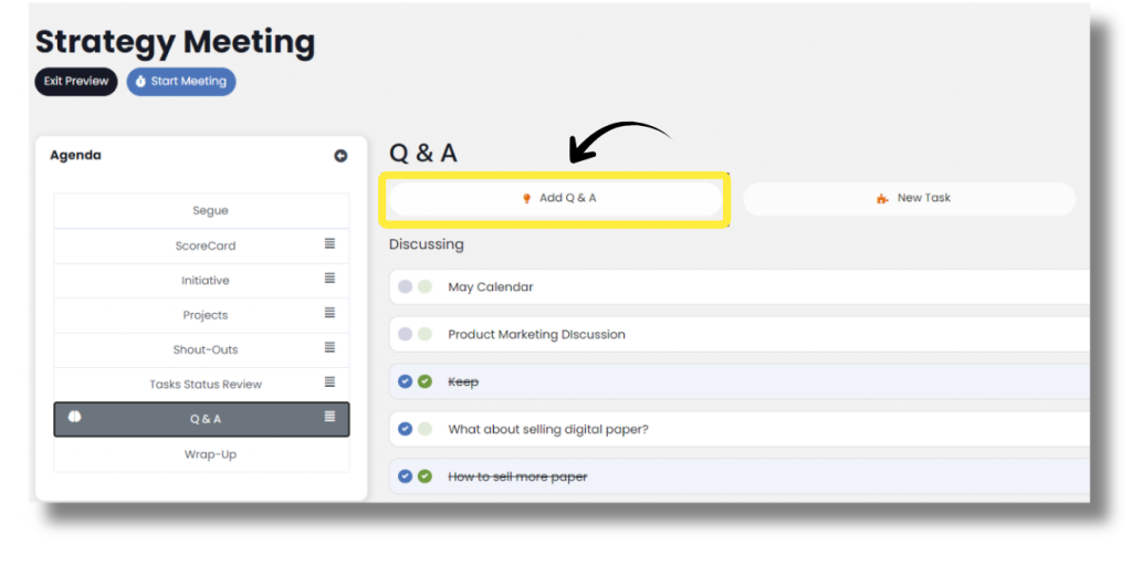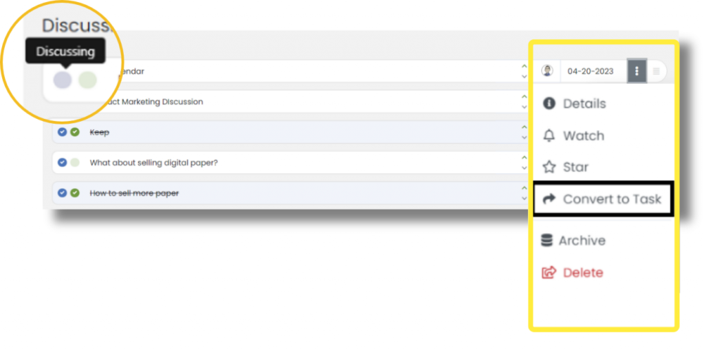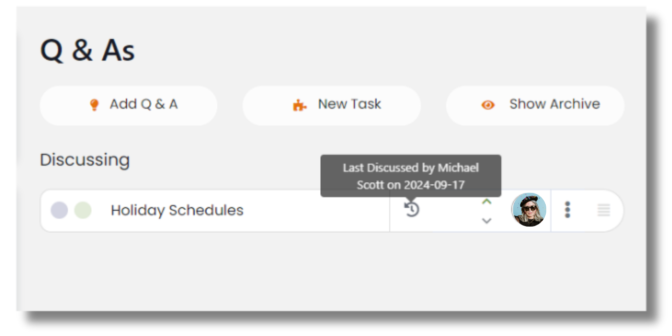 As topics are discussed, they may not be solved immediately. In your meetings, you’ll see an icon showing the topic has been discussed in the past. Hover over that icon to see the date it was last marked as discussed.