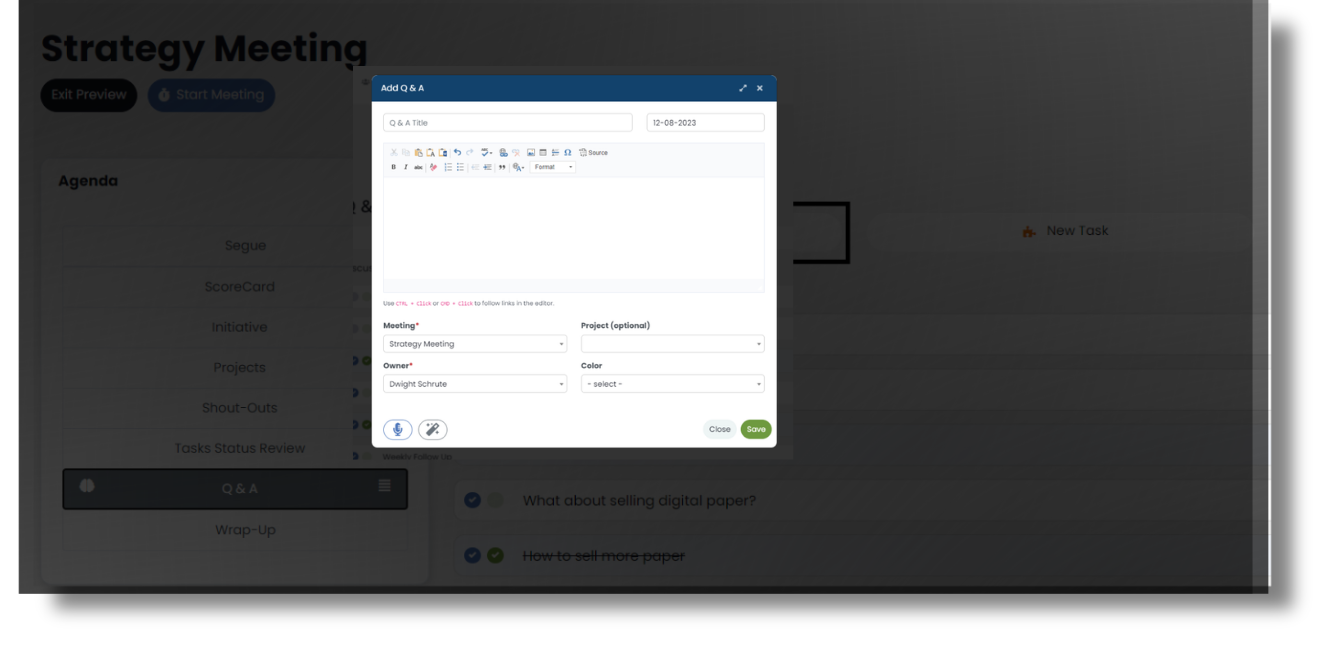 Whichever method you use will open the “Add Discussion” window where you can give that topic a name, add text, images, or links to the details, and assign it to a meeting and an owner. Optionally, you can assign the discussion item to a specific Project and select the color it will have in the discussion section of the meeting. Finally, select Save at the bottom, and the item will be added to the discussion list of the selected meeting.