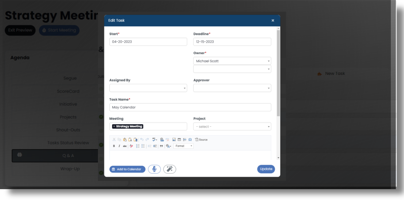 At this point, you’ll see the Add Task modal appear with information from the original Challenge pre-populated within. Here’s where you can break that Challenge down into a Task that has a due date, its own status, and an individual user responsible for it.