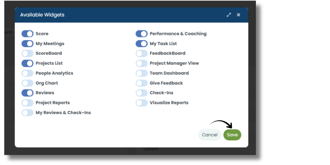Toggle the widgets you want and which you don’t want on your dashboard and click “Save”.