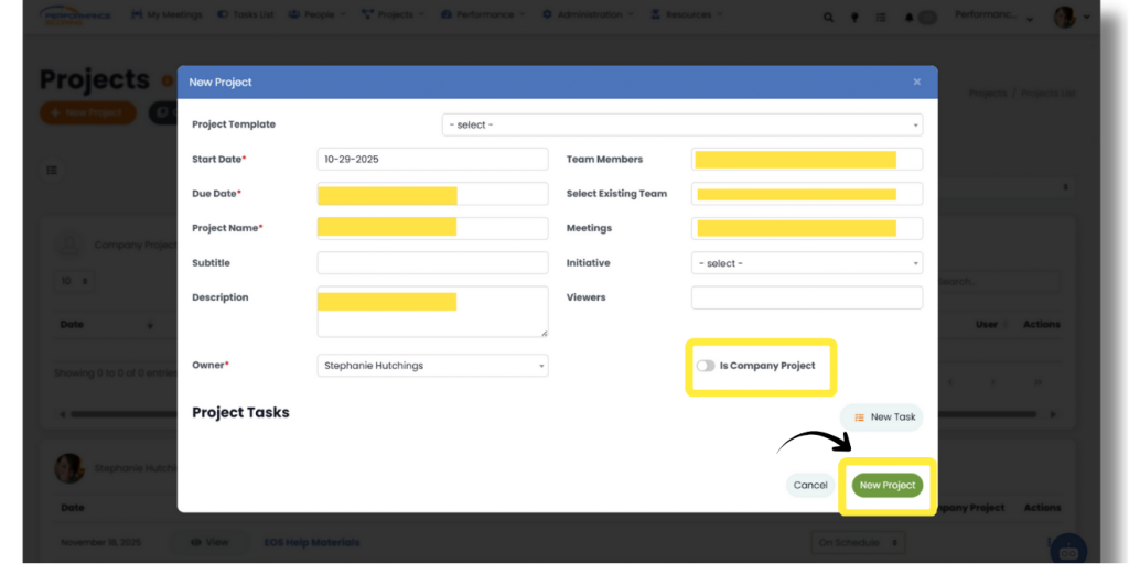 Enter your new Projects start date (defaults to today’s date), a deadline/due date, give it a short name as well as a shorter subtitle name (optional). Then, give the Project a high-level description.