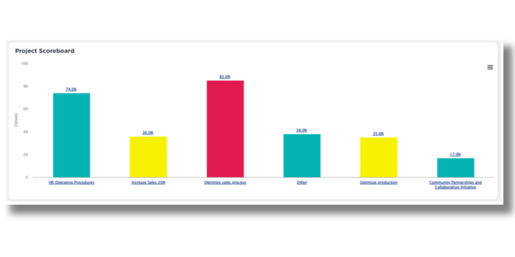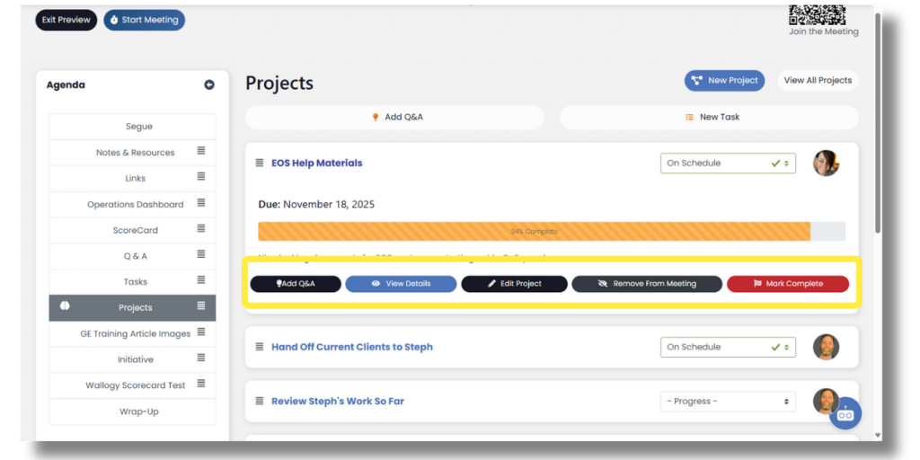 As we mentioned before, Projects that have been added to Meetings will appear in the meeting agenda. Each Project‘s percent of total complete is listed as well as how the Project Owner is feeling about its progress. There’s a “View Details” button to open a new window to drilldown into specific Tasks inside the Project that may require attention.