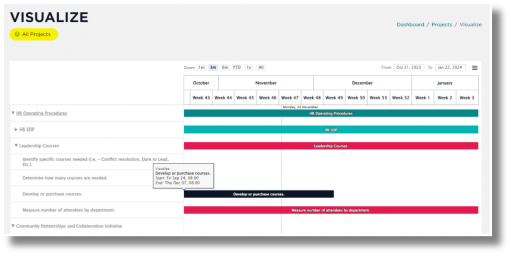 There is also a report which collapses Projects and Tasks into Initiatives and overlays them in a Gantt Chart. Click the “>” chevron on the left to expend/collapse each. If you drag & drop them horizontally, it’ll automatically update the start and end dates for you.