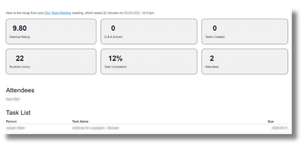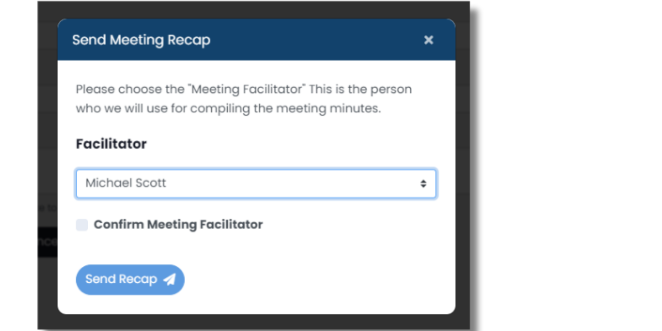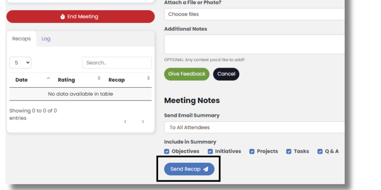At the bottom of the Wrap-Up, meeting facilitators can adjust the type of meeting notes to be sent in the Meeting Recap. Meeting notes can be sent by selecting Send Recap or End Meeting. SecureDB will create the Meeting Recap based on the chosen Meeting Facilitator’s time spent in each agenda section. A meeting summary email will then be sent to all attendees highlighting the important events that took place during the meeting, and this same summary will be stored in the “Recaps” tab.