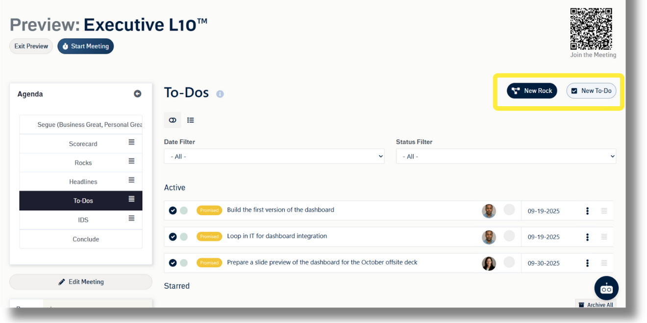 In the meeting preview, you’ll see all agenda items that are already associated with this meeting. Need to update deadline dates on any of your Tasks or add details? Did you start or complete any? Go ahead and make any and all updates you need to here.