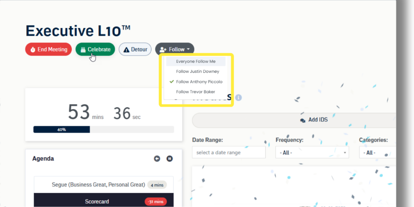 If you’re the meeting facilitator, and you’re ready to officially start the meeting, click “Start Meeting”. This will activate the meeting timer and turn on synchronous notifications for meeting events for all logged-in attendees. If users are already in the meeting preview when the meeting organizer clicks “Start Meeting”, their browser will automatically refresh and display the started meeting. You will also notice new buttons underneath the meeting title. Besides the obvious function of “End Meeting”, any attendee can emphasize success by clicking the “Celebrate” button, or if the discussion seems to be getting off topic, the “Detour” button can be selected. You can also use the “Follow” feature to make all attendees follow you through the meeting agenda or follow specific users.