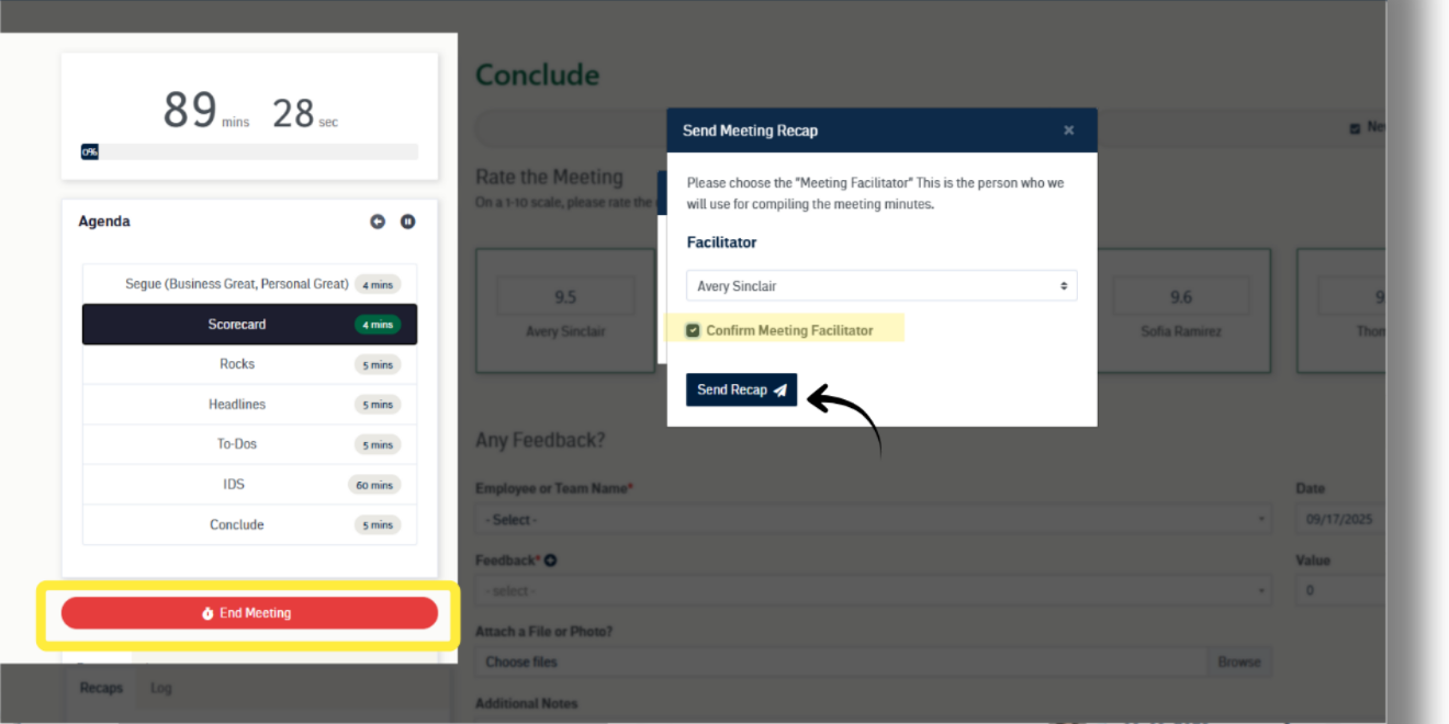 At the bottom of the Wrap-Up, click the button that says Send Recap. If you were the one primarily running the meeting, select yourself as the Meeting Facilitator and click Send Recap. A meeting summary email will be sent to all attendees highlighting the important events that took place during the meeting, and this same summary will be stored in the “Recaps” tab.