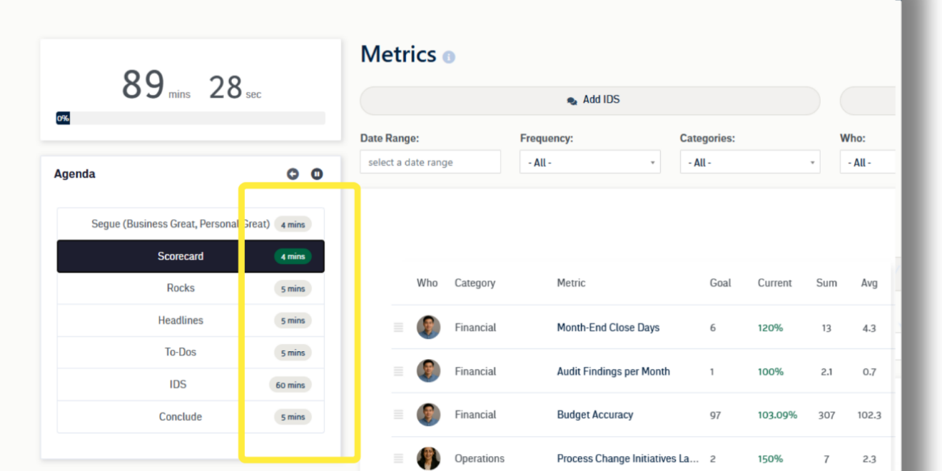 Start at the first section of the agenda then run down the list. The time allotted for each agenda item can be seen to the right of each agenda section title. When an agenda section is selected, the time displayed will decrease with each minute that passes. Once the time for a section gets down to 1 minute, the time pill will change from green to yellow. The pill will turn red and a negative number will be displayed once the allotted amount of time for the section has elapsed.