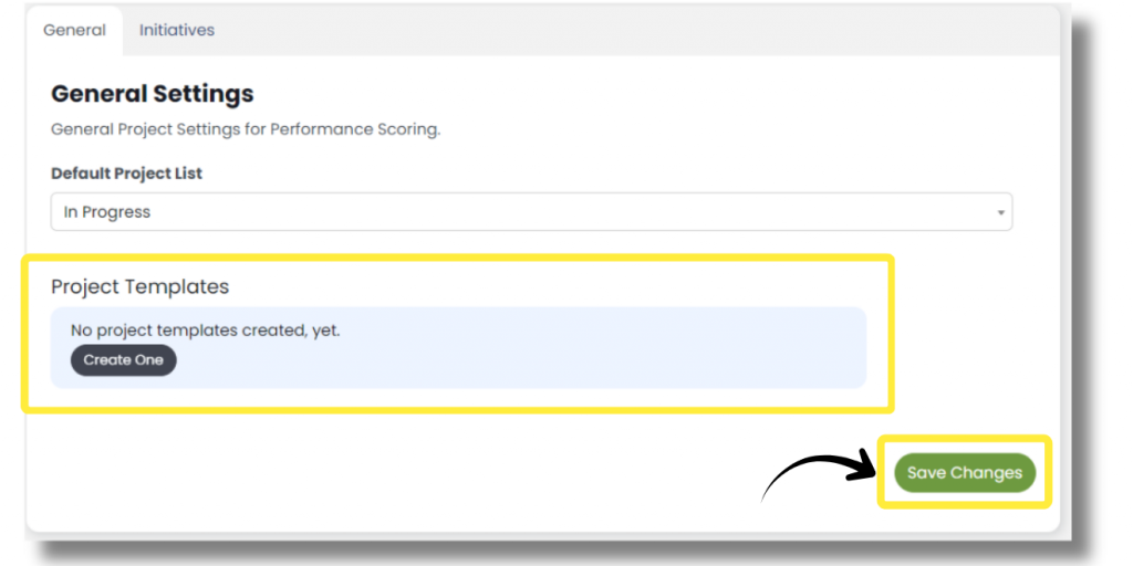 From Project Settings, click the “Initiatives” tab. For each Initiative, give it a name, a start date, and an end date (since the application doesn’t know when your next board meeting is or what a reasonable timeframe for that big goal might be).