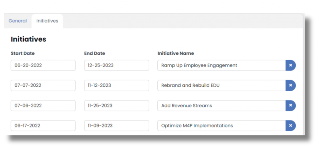 Remove Initiative rows by clicking the “x” on the right of that row. Click the “+ Add Initiative” button to add a new row.