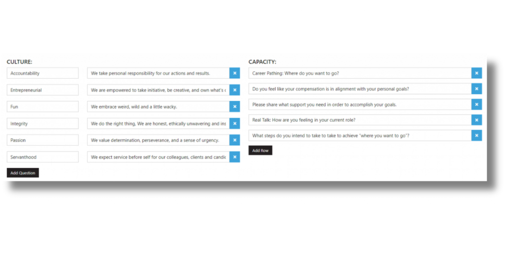 The Values that define your Values and the criteria that contribute to Alignments (culture and capacity) fit, so your staff are evaluated on a matrix with one box for each of these areas of fitness. These are organization-wide and managed via Company Settings.