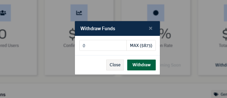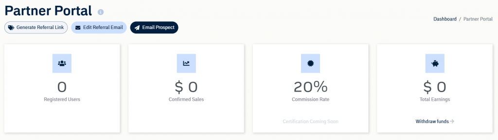 From the Partner Portal dashboard, you have access to the number of active users who have signed-up, the dollar value of the sales your referral link has generated, your commission rate, and the total about of un-withdrawn funds.