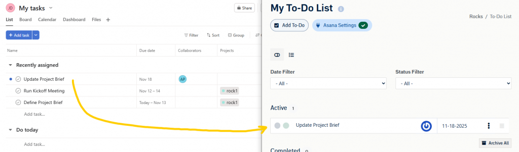 You can integrate directly with Asana to keep your Tasks and Projects perfectly in sync. Once connected, updates flow both ways — meaning changes made in either platform automatically appear in the other.