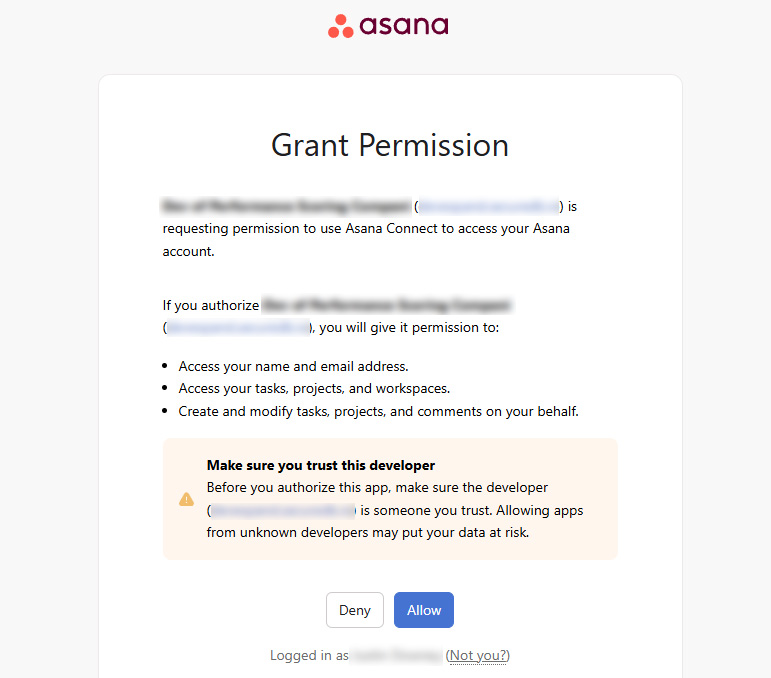 - Log in with your Asana credentials and Grant Access authorize SecureDB to access your account.