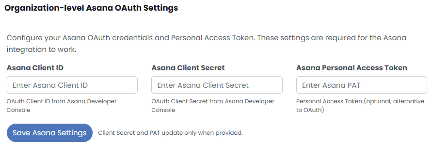 These settings are required one time per organization and must be completed by an administrator. They allow this system to securely communicate with your company’s Asana workspace. This section configures how your entire organization connects SecureDB to Asana’s API.