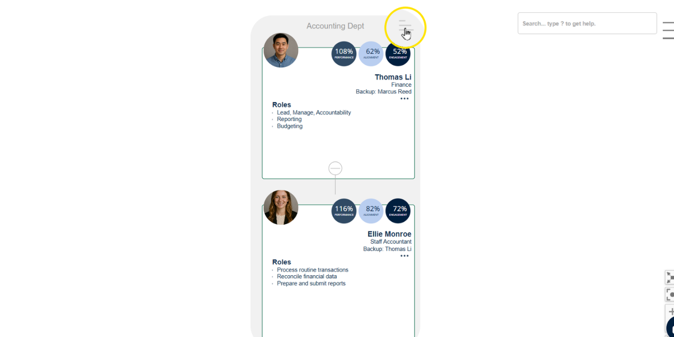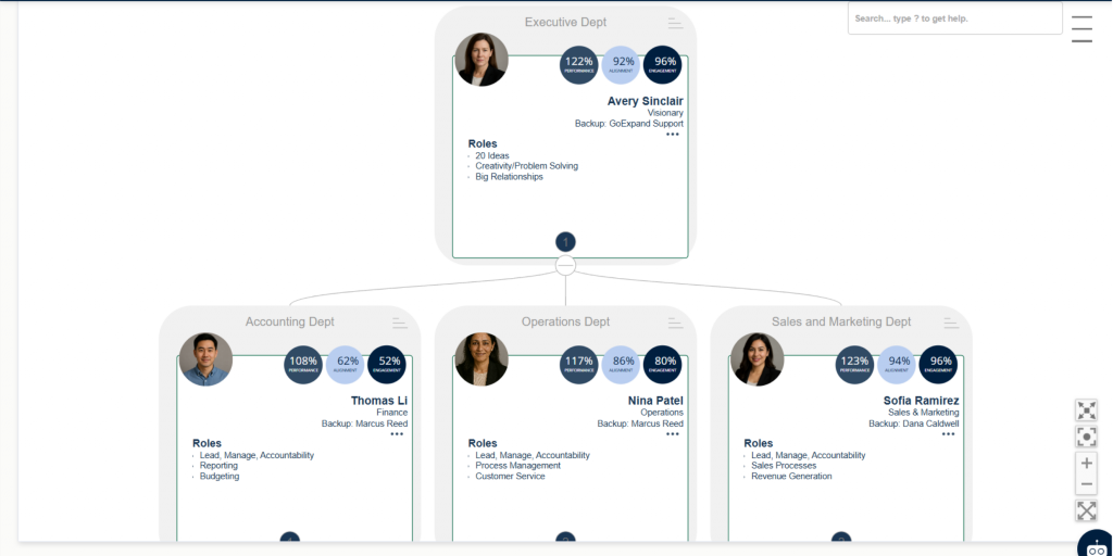 Here’s an example company. In the following Accountability Chart, you’ll see all the people Avery Sinclair can see data for, because all of them report-up to him in one way or another.