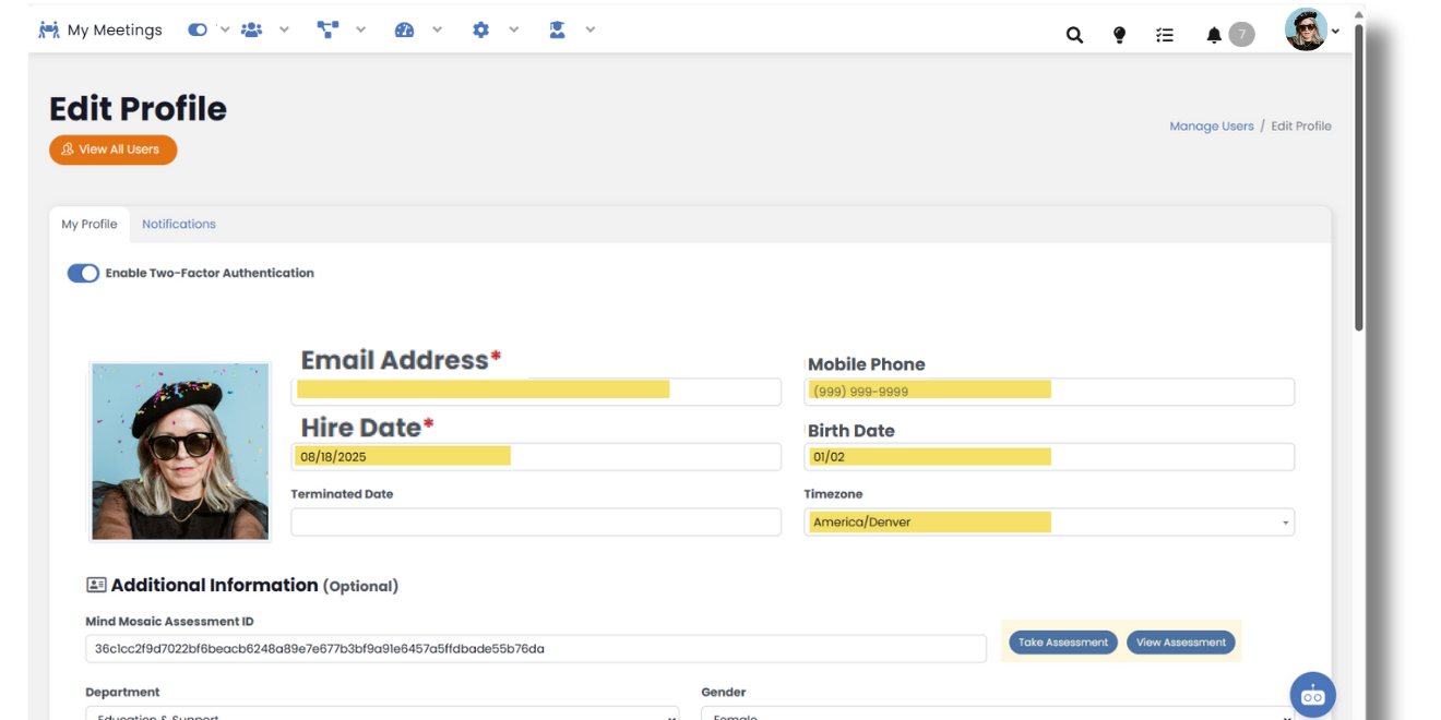 On the left-hand side of the first section you will see your name, profile picture, and the option to turn on Two-Factor Authentication. Check to make sure your hire date is correct and update it if you have permission from your manager. It’s doubtful you want to enter a termination date 😉 In this section, you will also see a tab for Notifications, which allows SecureDB notify you of certain activities within the application. Notification setup is covered in detail HERE.