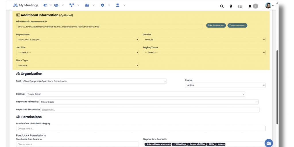 The next section of your profile is purely optional, additional information. Check to make sure everything is how you want it. If your company has chosen a behavioral profiling model, your profile will be listed here as well as your Department, Job Title, Region or Team, Gender, Generation, and Work Type. Click the drop-down boxes to change any information as needed.