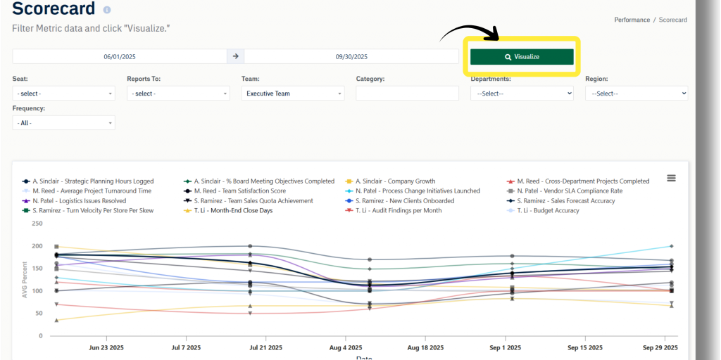 - After setting your parameters, click Visualize to generate the customized Scorecard view.