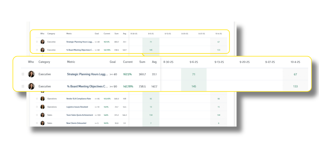 A sliding table sits behind the left side of the table and displays Objectives for the selected frequency; columns also match the frequency. The column all the way to the right is the most current period. Tiles will be green if they match the desired value(s) of the Objective, and tiles will be red if they are not within the desired value(s).